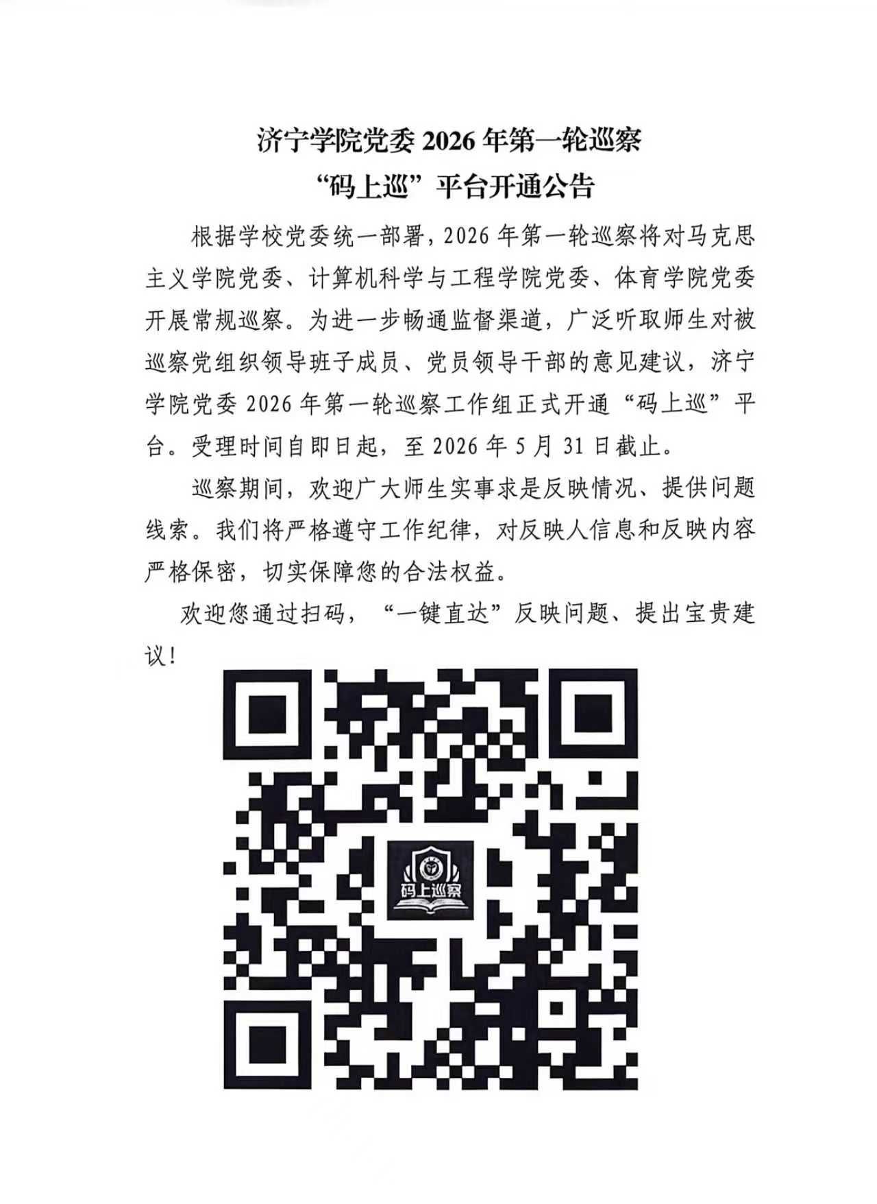 济宁学院党委2026年第一轮巡察“码上巡”平台开通公告